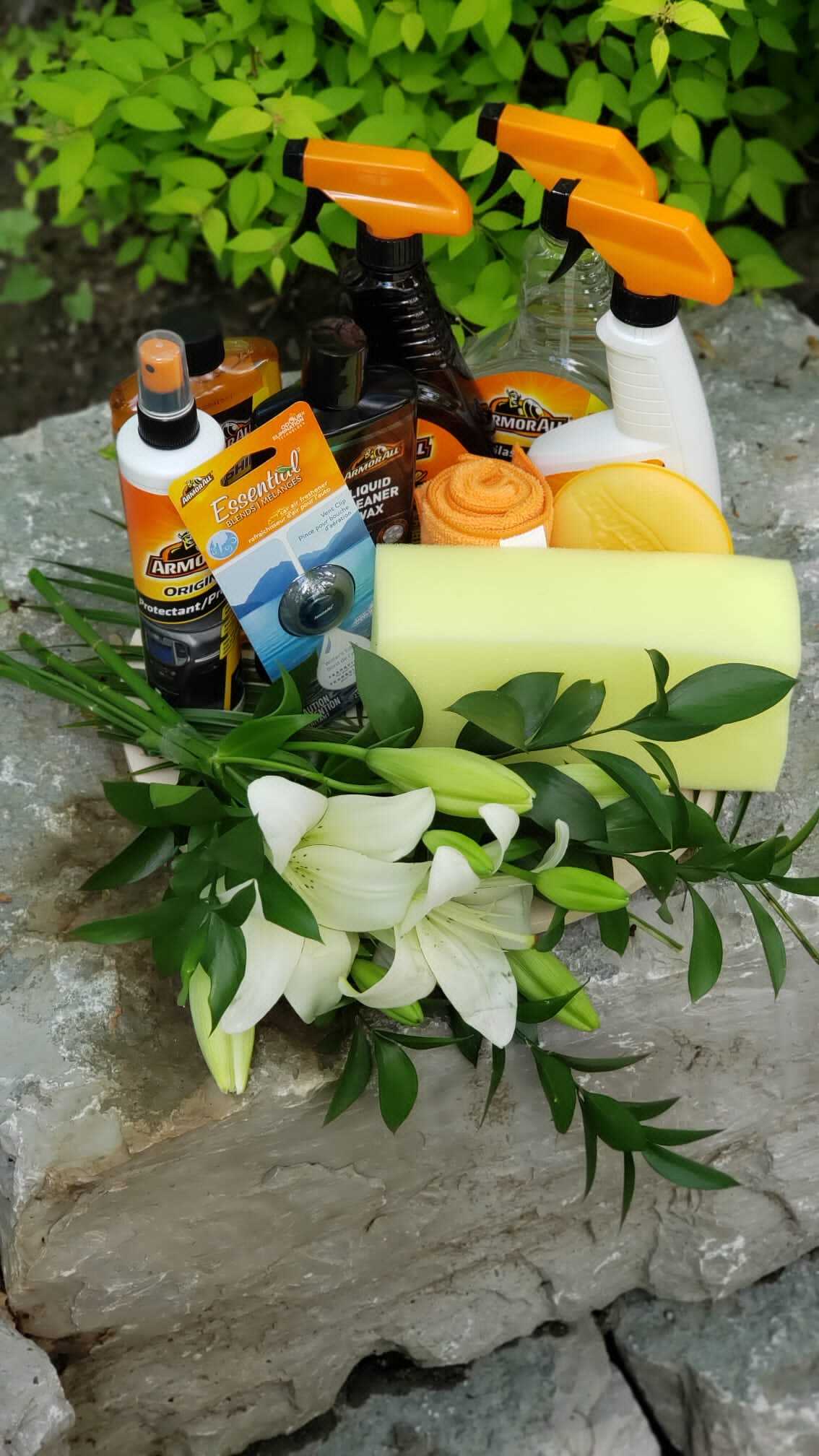 This arrangement comes with 7 different Armor All Products, 1 large sponge, 1 small round sponge and a car freshener.
