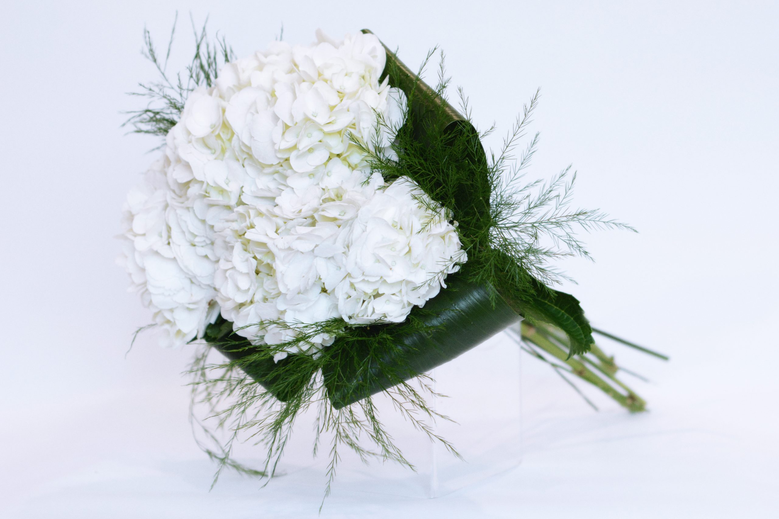 Blanka is a simple but elegant bouquet of 3 stems of hydrangea and is surrounded by Aspidistra leaves. (Shown is the Sweet size bouquet)