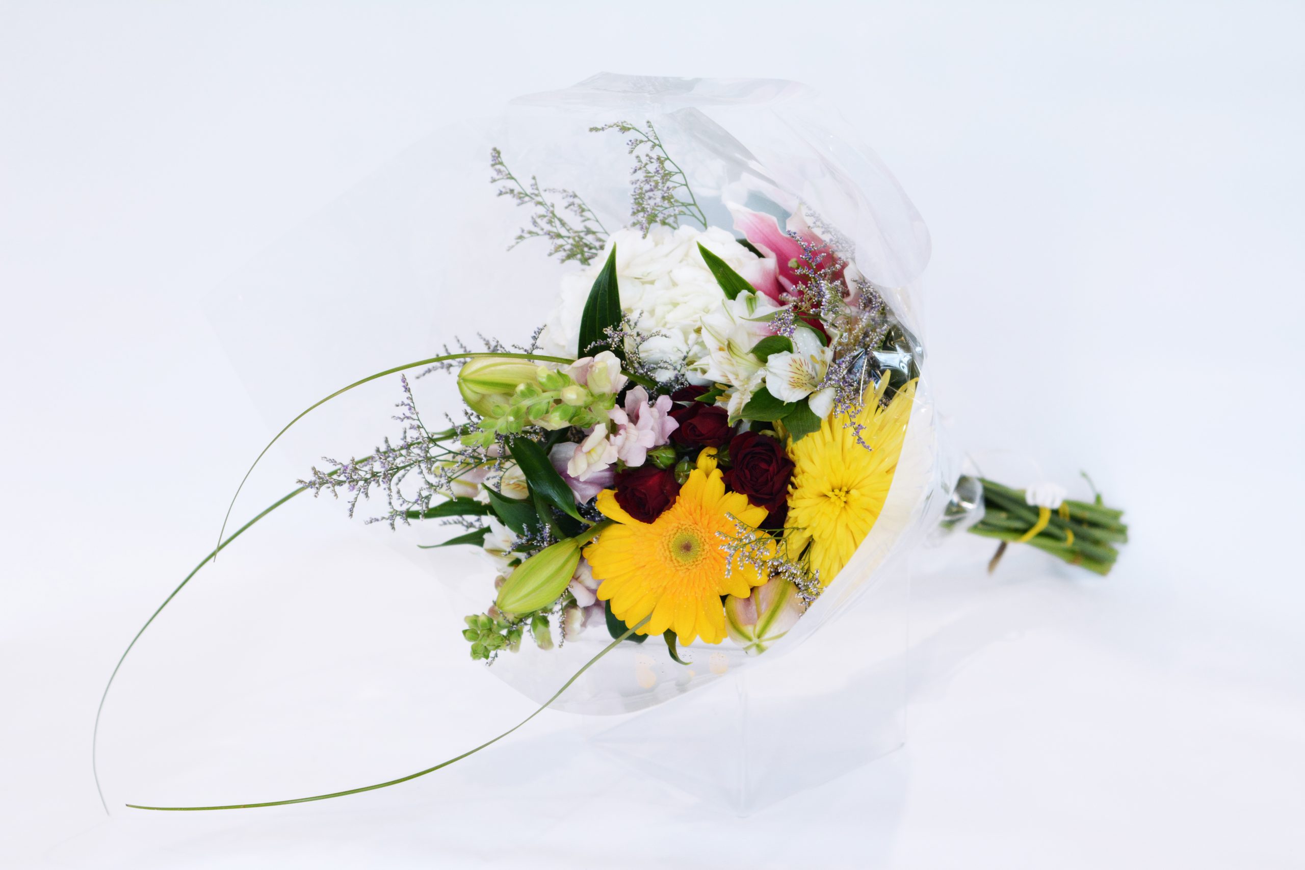 Elena is a bouquet made with a Stargazer Lily, 2 Stems of Snapdragon, 2 stems of Alstroemeria, 1 Gerbera Daisy, 1 Fuji mum, 1 spray rose, a hydrangea, accented by greens and by filler flowers.