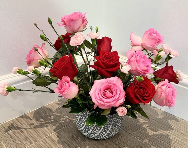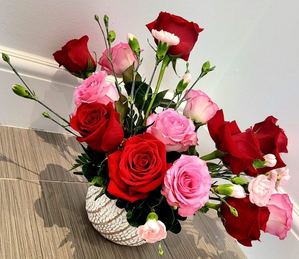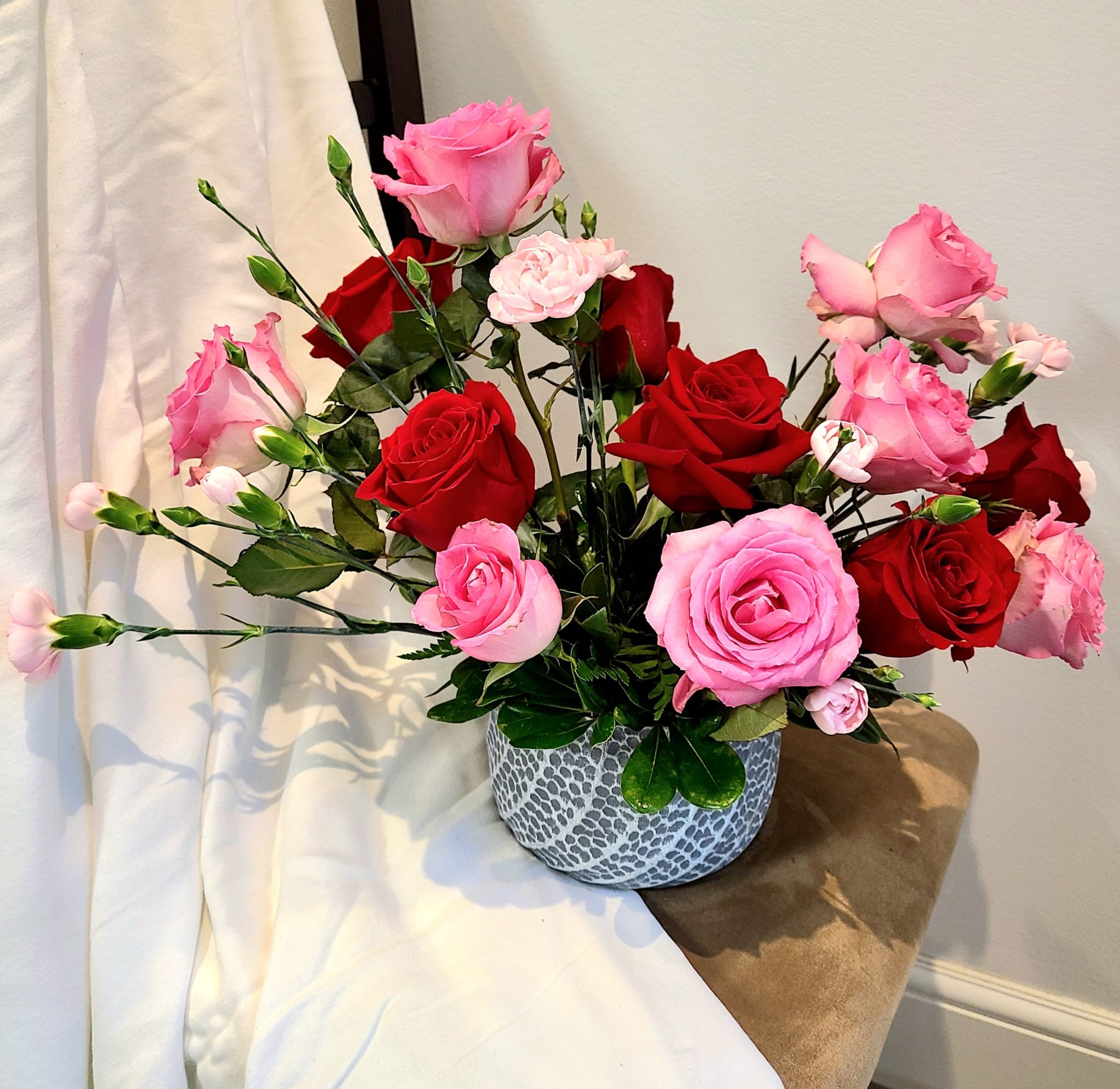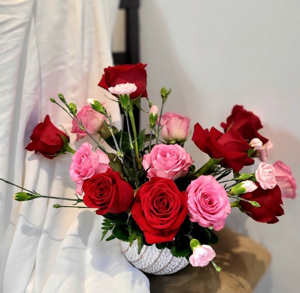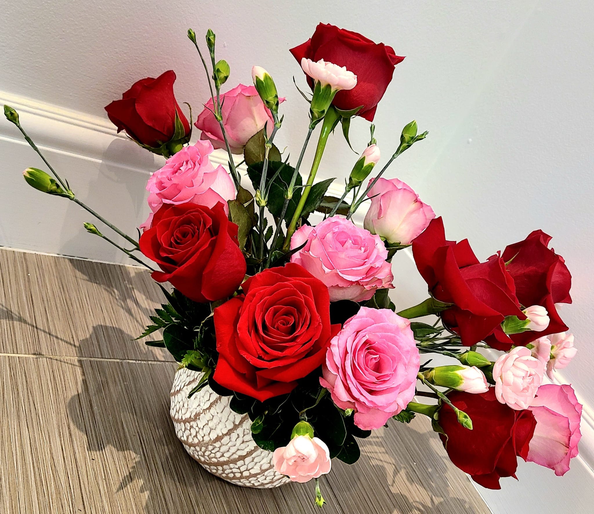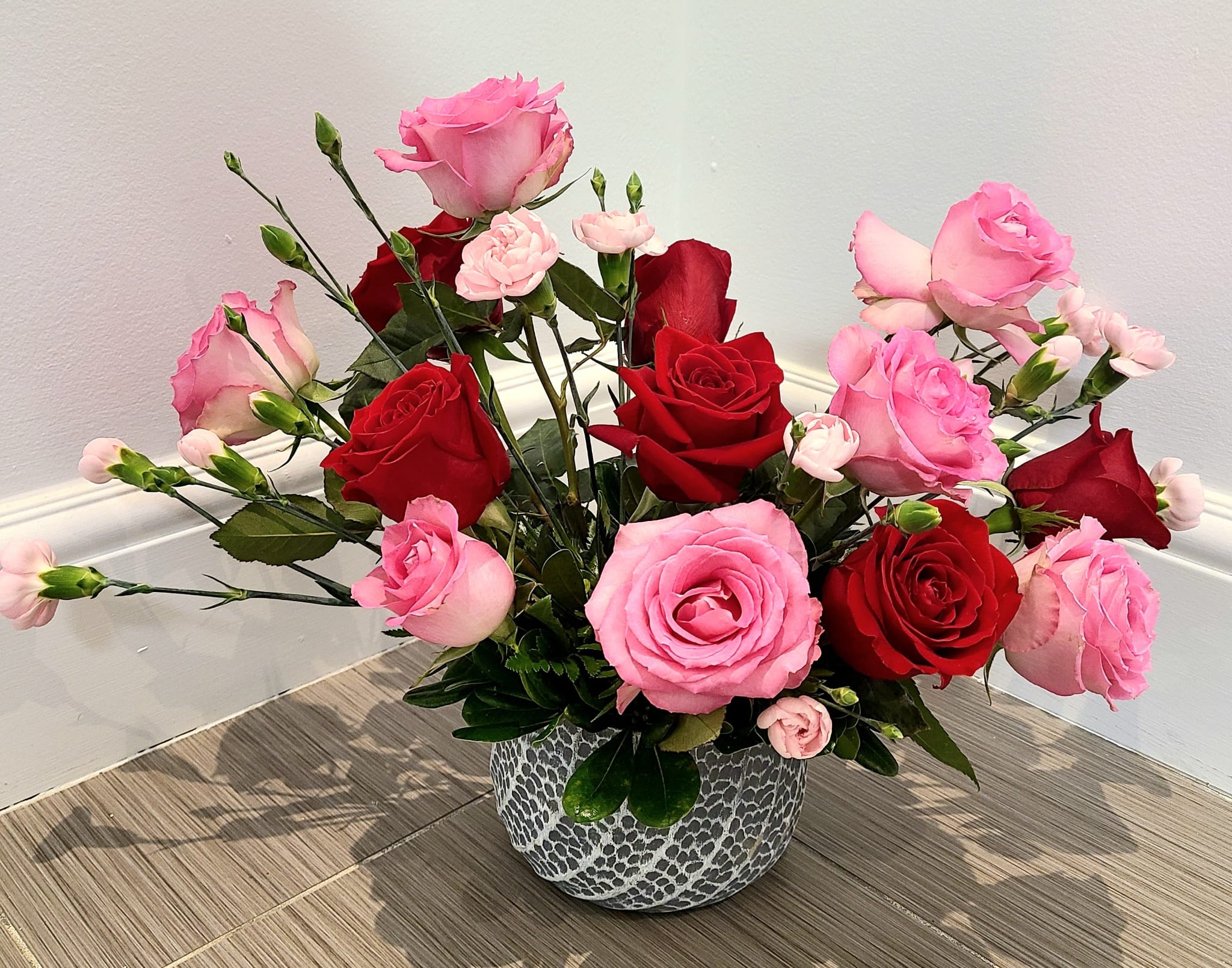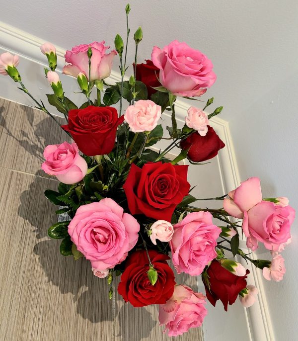 Sara-Anna is a beautiful modern arrangement. It contains red and pink roses, as well as pink mini carnations.